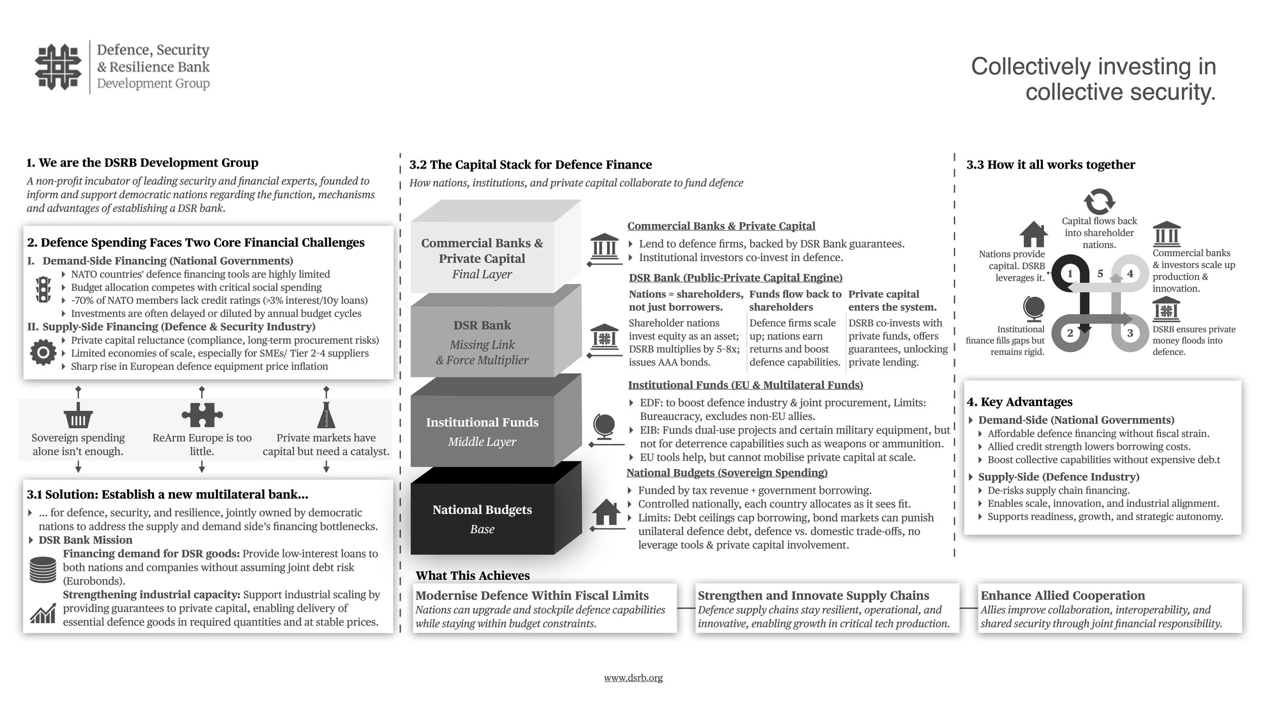 The DSR Bank empowers allies and partner nations to invest in their own defence on their own terms—strengthening economic sovereignty, deterrence posture, and strategic autonomy, while embedding key democratic partners in a common security framework.
